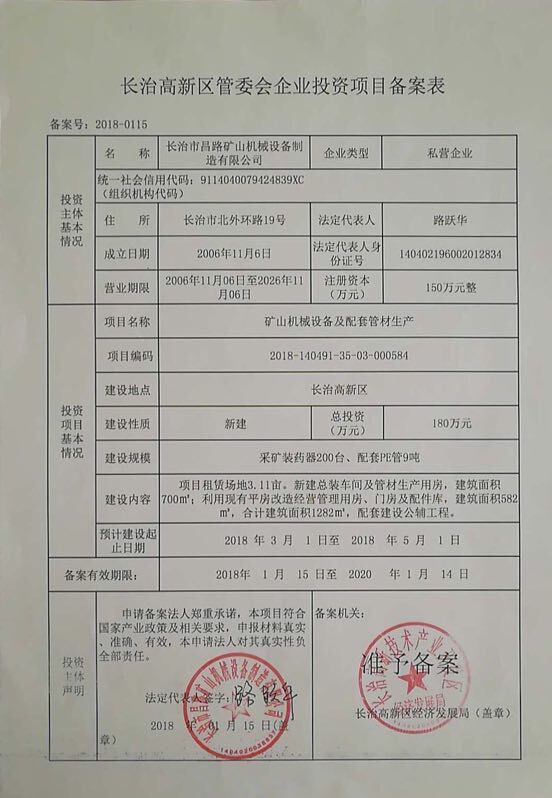 長治高新區(qū)管委會企業(yè)投資項目備案表